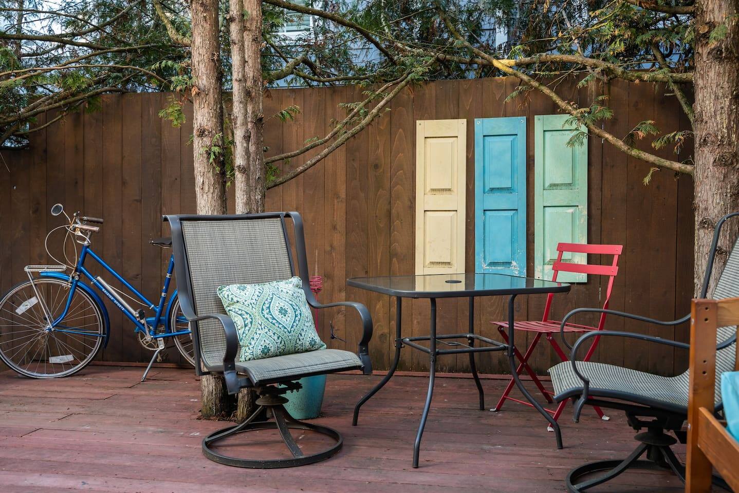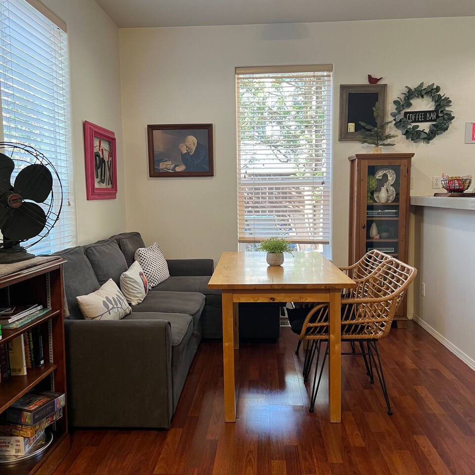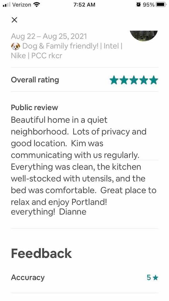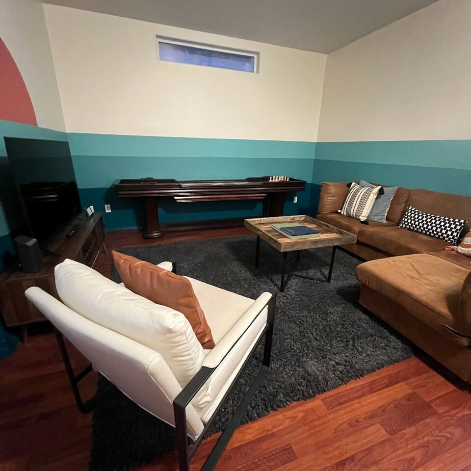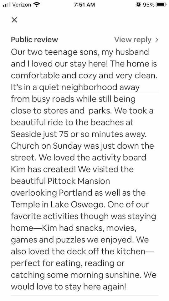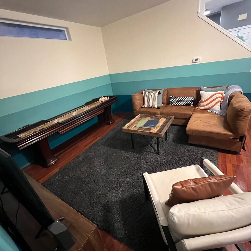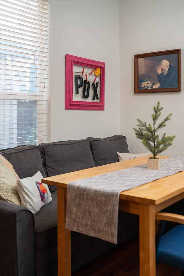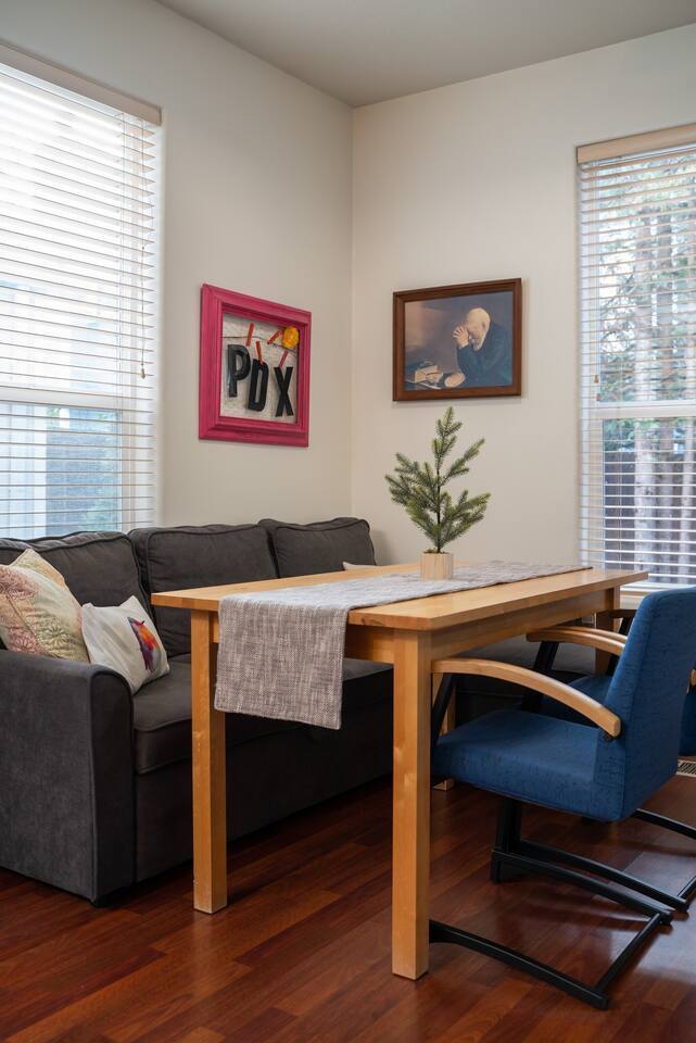 Who around here has shuffleboard in the living room?! Perfect for Covid conditions where so many bars and restaurants have restrictions. Plenty of games and things to do in our home. Full kitchen with everything you need to cook at home. Main bedroom upstairs with full attached bath, desk area, tv and small loveseat. Main family spaces downstairs with kitchen, living room, shuffleboard table, and great deck. Queen sleeper sofa can be curtained off for a bit more darkness and privacy, even though it’s in the living room. Much more privacy than average. A second couch for a 5th traveler is available to sleep on as well. There is a full second bathroom upstairs with shower and a half bath/laundry room downstairs. The deck out back is a great spot to sit and chat in the evenings. Trees give a cozy feeling of privacy and that northwest feel. Feel free to park in the driveway. If you have a second car, free, safe and easy to find parking is very close to the house. It is in a quiet residential neighborhood. This is our home when we are not away traveling, so you will see that it has everything you need to live comfortably as well as traces of our family personality. We have had guests for so many years and we love sharing our home with travelers who appreciate our Portland vibe and roots.